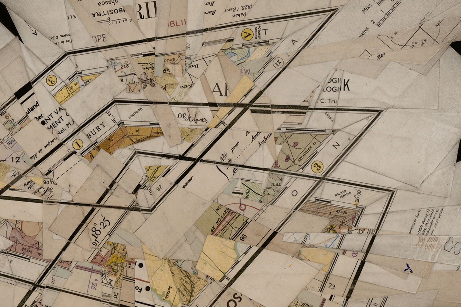 Cut and Reconstituted Map Fragments on Acrylic ground with canvass and wooden substrate